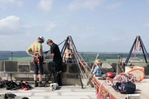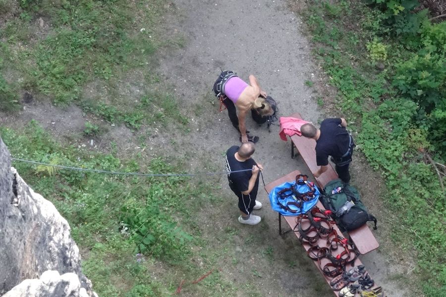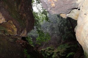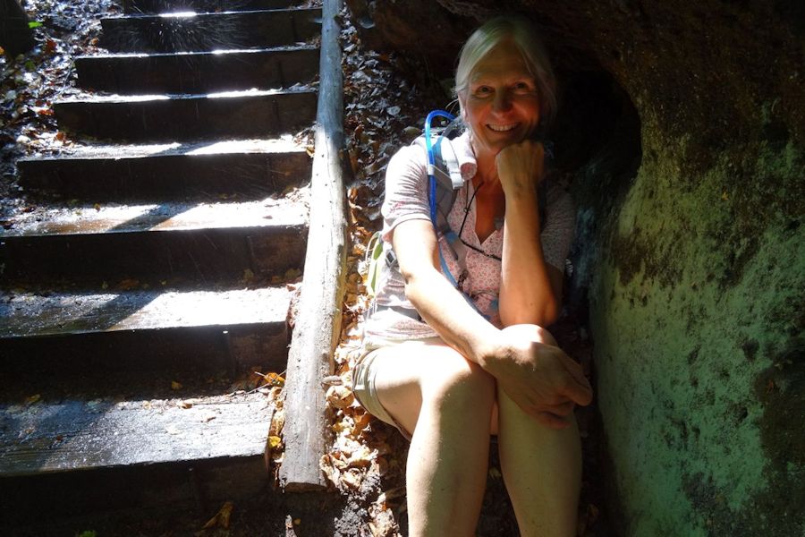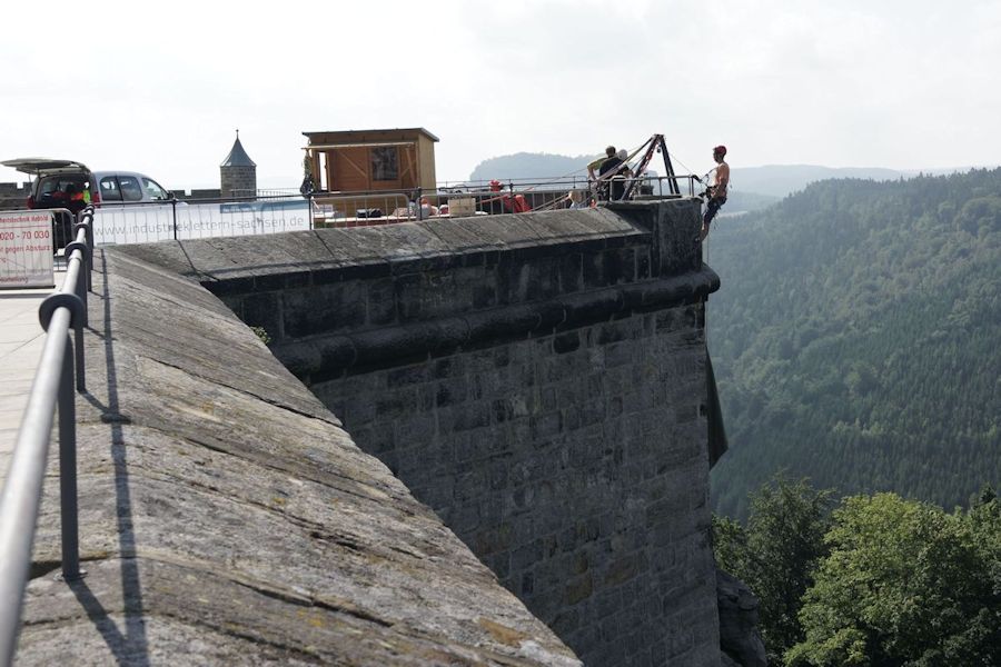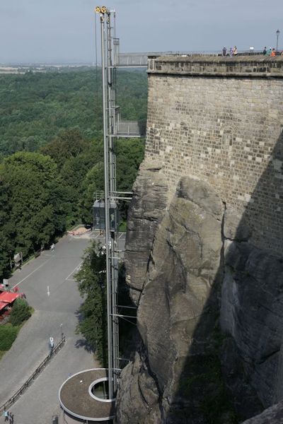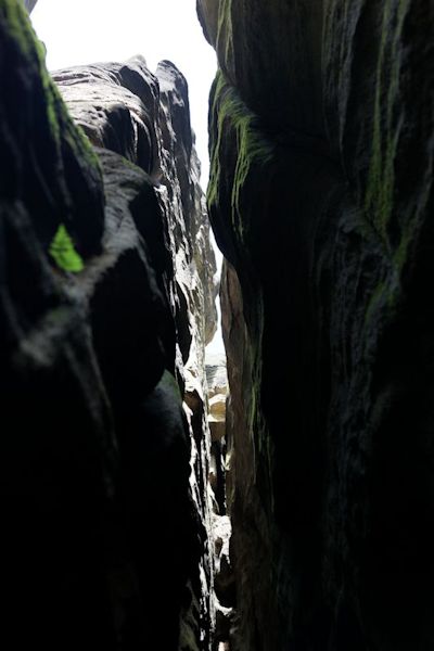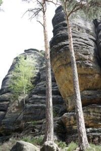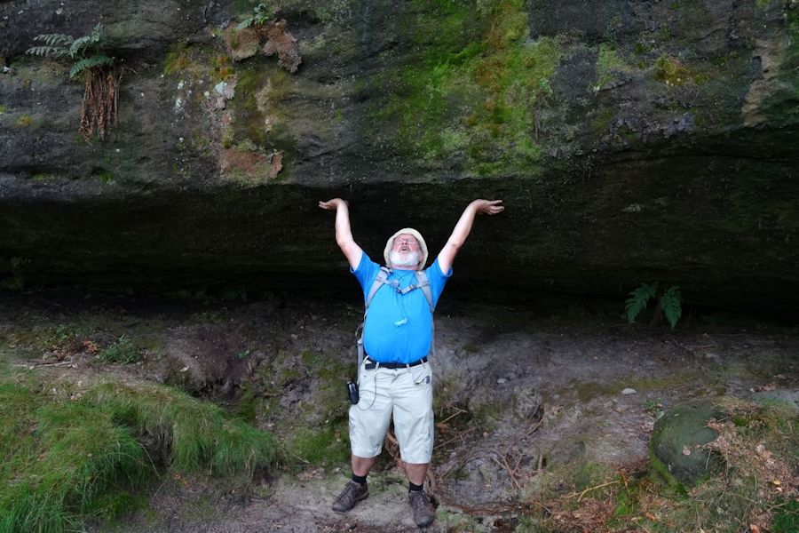 De dag begon met een boottochtje naar Bad Schandau, een druk toeristenplaatsje en vanoudsher een (lucht)kuuroord. Hier namen wij de historische tram naar de Lichtenhainer waterval. Een mooi tochtje door het dal van de Kirnitz waar het toerisme heerlijk bloeit. Bij de waterval is voldoende bier en wurst om de week door te komen. We nemen een torte met koffie alvorens 13 km terug te wandelen naar ons hotel in Krippen. De eerste stop was bij de kuhstall, een immens grote doorzichtgrot met een bijbehorende gaststätte. Onderweg wordt het steeds minder druk en zeker als er af en toe een bui valt is er geen mens meer te bekennen. Schuilen voor de regen in de vele spleten en holen kan heel romantisch zijn. Ook weer veel ladderklauteren met bijzondere uitzichten en enkele enge passages(idagrotte).