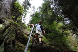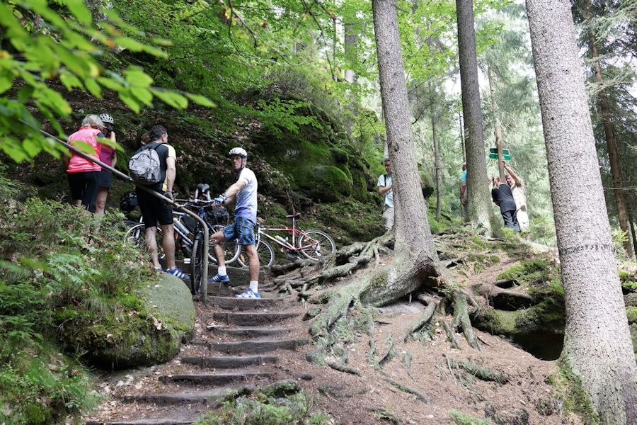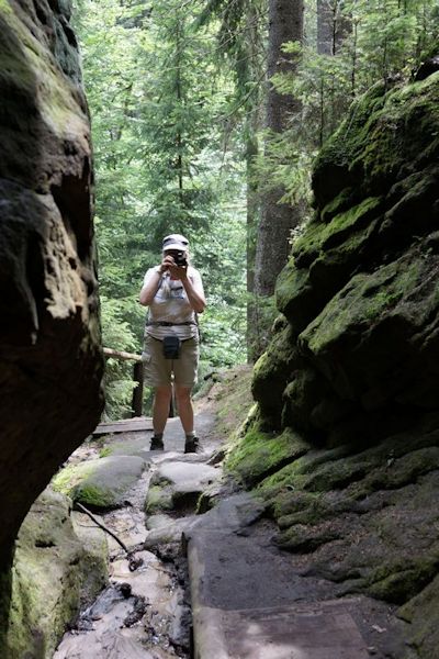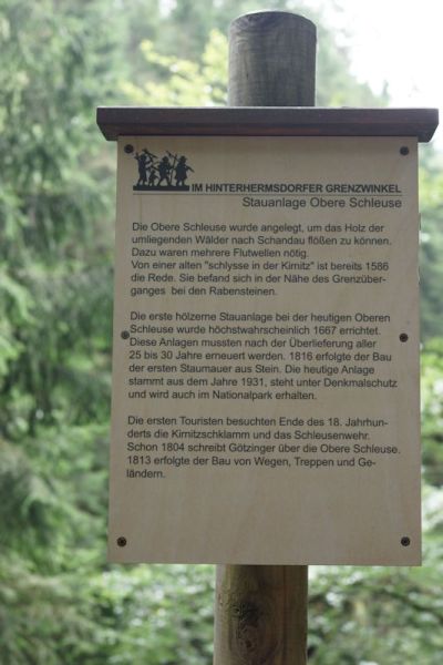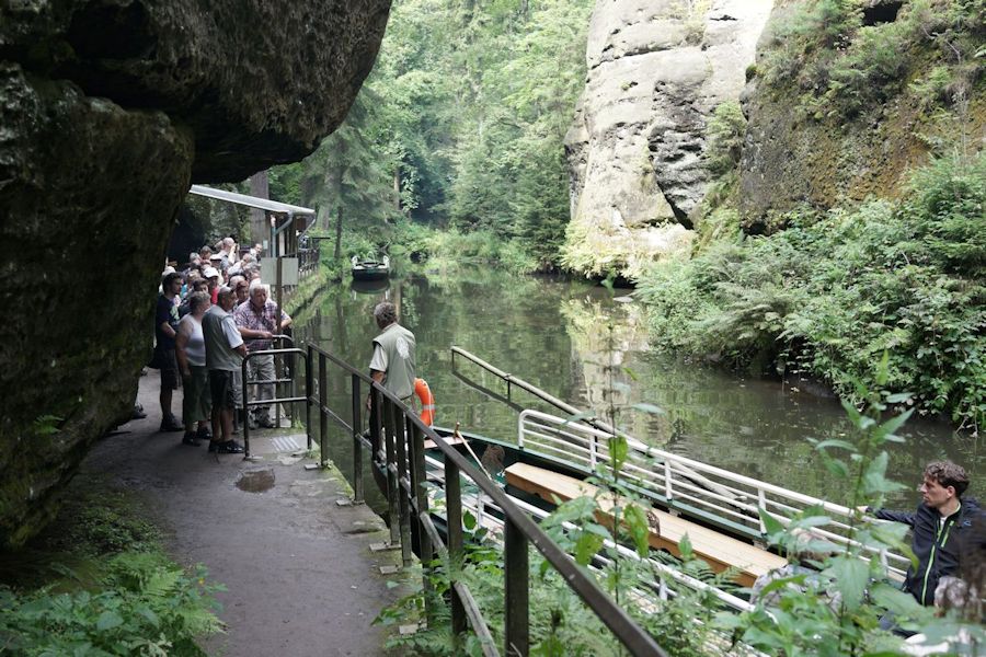 Vandaag een wandeling door het dorpje Hinterhermsdorf naar de Obere Schleuse in het riviertje de Kitnitz. Hier kun je een boottochtje maken over de afgedamde rivier. Er stond een wachtrij van 1 uur. De wandeling langs deze stroom op de grens met Tsjechie was buitengewoon mooi. Een prachtig pad vlak langs of hoog boven de rivier. Een gebied waar je maar af en toe een wandelaar zag en af en toe de zon.
